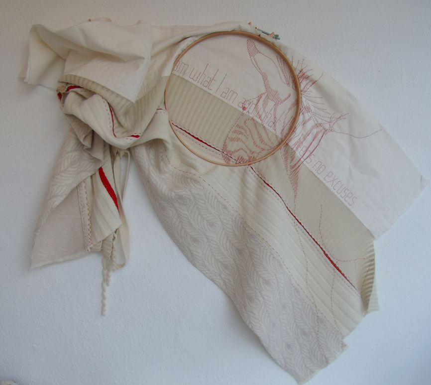 I find that the great breadth of foundation courses are brilliant for introducing students to a wide range of ideas and media but after a few years ‘at home alone’ the personal and, let’s face it, the available will re-assert itself. This situation can lead people to feel that they are not being adventurous, or the work doesn’t count as it is made of such mundane materials. But I think that this is the real strength of textile practice, for the most part it can be made using materials that are readily available, and these materials are the stuff of everyone’s lives and so are have many and varied associations with which to connect – for both makers and viewers. One thing that good foundation courses do give students is a sure sense of self-critical analysis, and this Caroline had acquired, if anything she was too critical, getting things ” too perfect” had rendered much of her latest work a bit lifeless, and she knew this – but how to remedy this is part of why she has come to me for help.