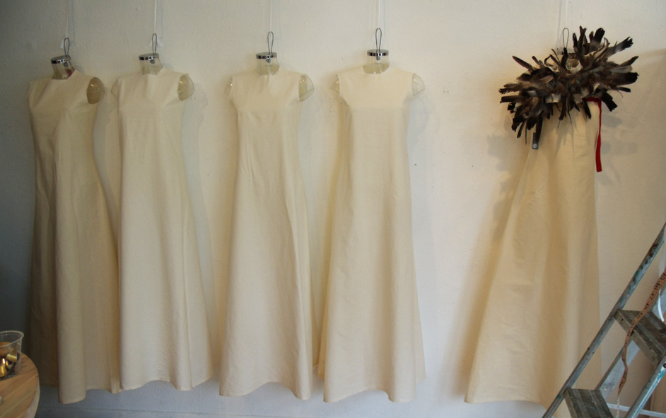 The first things brought in were a series of clear plastic torsos which were then dressed in simple calico shifts before being hung on the wall.