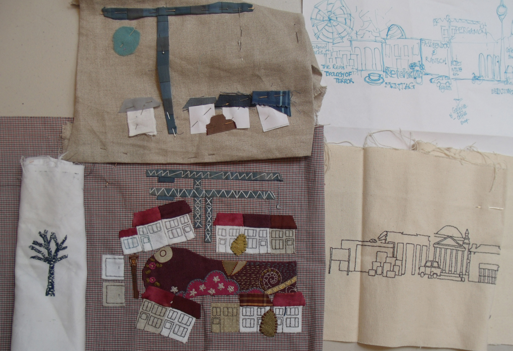 We now had to look at what was in front of us, decide what was to be developed immediately, what could be parked for working on later when there had been more time for fresh research, and what could be safely consigned to a folder or file of past experience. I had grouped several half – worked embroideries and drawings together, they seemed to relate to a celebration of the city and street life, I liked their vivacity and thought that they could be somehow ganged up together to make a larger patchwork piece. This means they have to be somehow made to work together, more of the simple line drawings can be assimilated worked as appliques or linear stitching and as made into a textile map of Caroline’s geographical space.