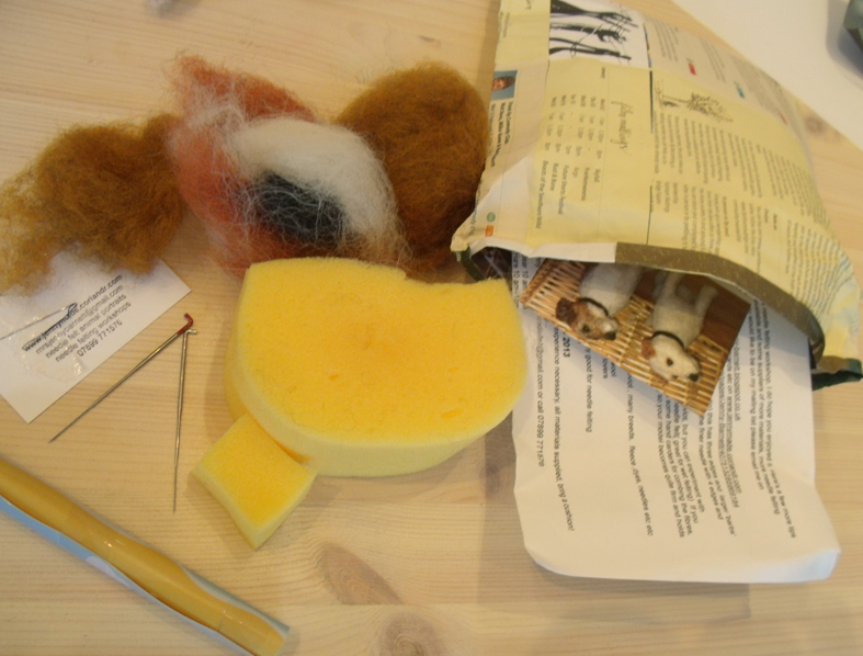 It comprises just a few simple things – wool tops in assorted colours, the special barbed needles for felting, a sponge to work on and some written instructions. Jenny also packed some love-heart sweets into the bags for her first visit to Heart Space Studios.