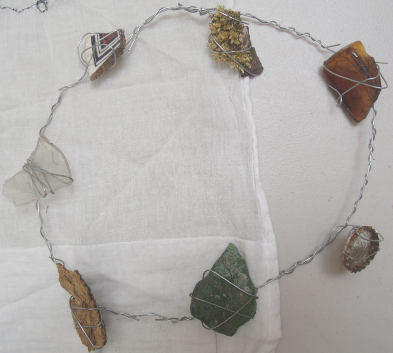 I was beginning to see the connection between the vintage embroidered verse – almost a prayer – that had come as piece of inspiration, with this almost sacred treatment of her Irish heritage. I started to ask about this connection and heard how Caroline still felt deeply connected to her Irish roots, still retained a religious faith and was now concerned with working with evidence of her family background, maybe using photographs, maps and other found objects. The most arresting piece that she showed me from this set of work was literally found – on a land fill site where she had made a necklace from shards of broken glass, pottery and stones – again a sort of secular rosary ….regarding or touching the objects made the viewer consider other lives, other places, tiles, bottle caps, lichen, glass, bark…..