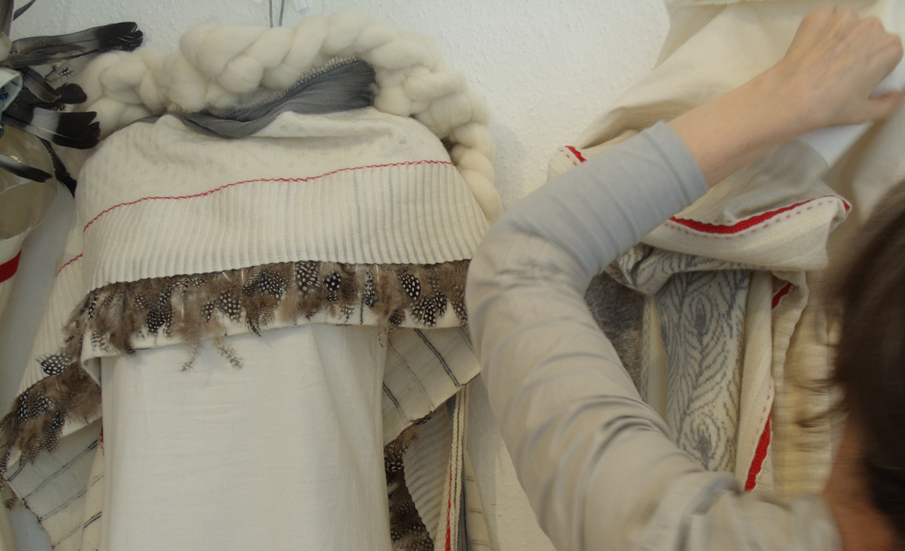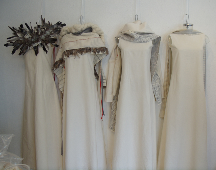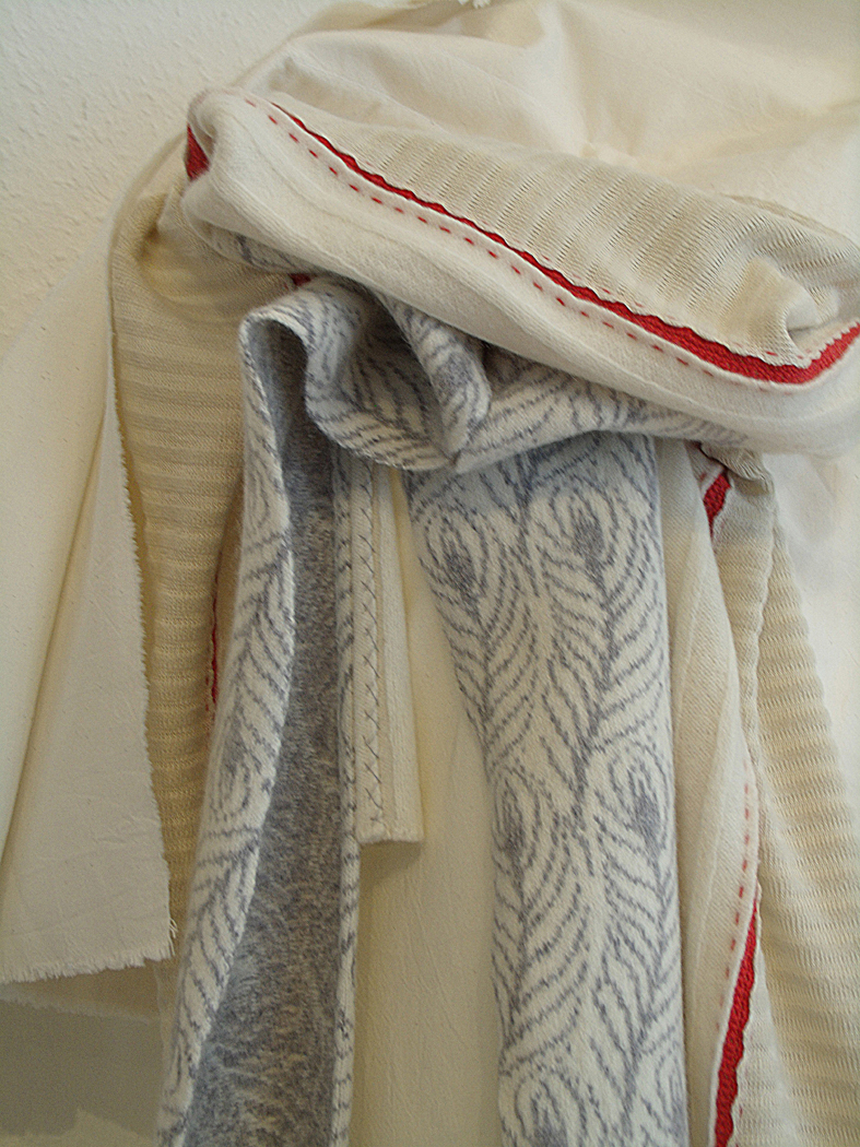 We have a wonderful new exhibition at Heart Space Studios. It is a collection by Stephanie Wooster ( who conducts unusual knit workshops with us) developed from her MA studies and it concerns itself with wrapping, tying and generally caressing the upper body. the names of the different pieces tell how they are perceived by the maker – Swaddle, Swathe, Shawl, Sheath, Mantle, Shroud. The work is embroidered, felted, machine knitted, plaited and patch-worked together, with feathers, braids and calico. It sets a calm but slightly surreal feeling to our small gallery space.