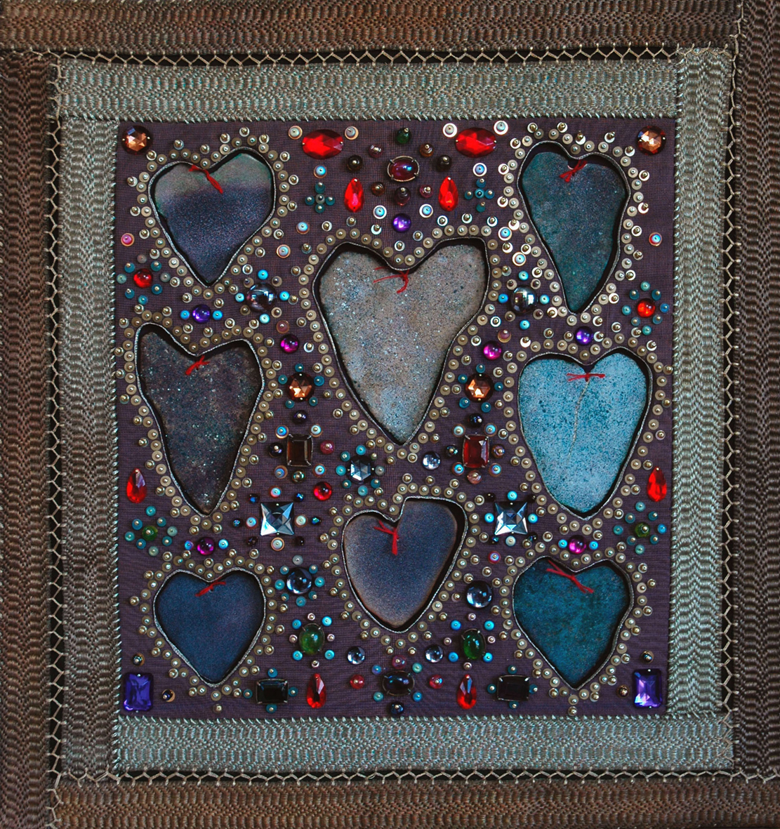 I also made a larger piece for an embroidery exhibition where I made 5 Icons and Icon covers for a series of enamelled hearts. I was playing with the idea that the stones themselves are worth nothing, the only value invested in them is by the viewer, the maker – in this case the collector. The surround or cover is made from heavy silver braids and watered silk pinned with all kinds of metal and glass beads. the hearts hang loosely, recessed within the cover which acts as a protective and glorifying surface. This particular embroidery was sold in a Valentine’s day exhibition at the Twenty Twenty Gallery in Much Wenlock.
