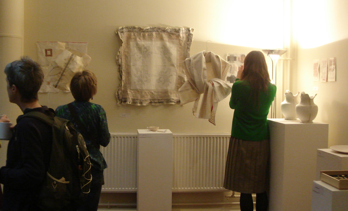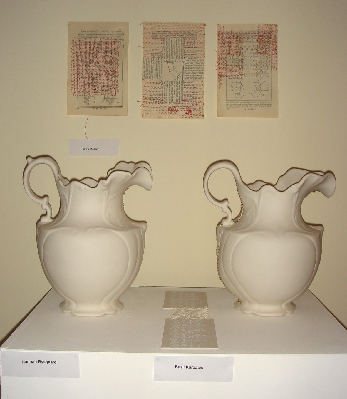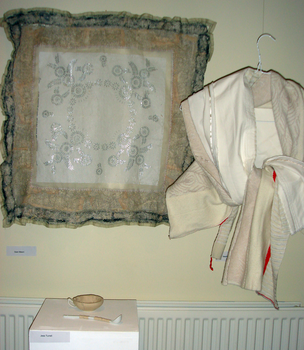 Dawn Mason's embellished collage with Steph Wooster's hanging wrap and Jess Turrell's mended tablewareJilly Morris - stitched plasters and velum torso.Dawn Mason stitched papers and mended jugs by Hanne Rysgaardmended by me. with small sample of porcelain by Hanne mended by Basil Kardasismy handkerchiefs and mending - motto plate - mended by Jess Turrel mended sweat shirt by Matt Benton with box of darning brooches, Dail Behennah - who was the key-note speaker at the conference