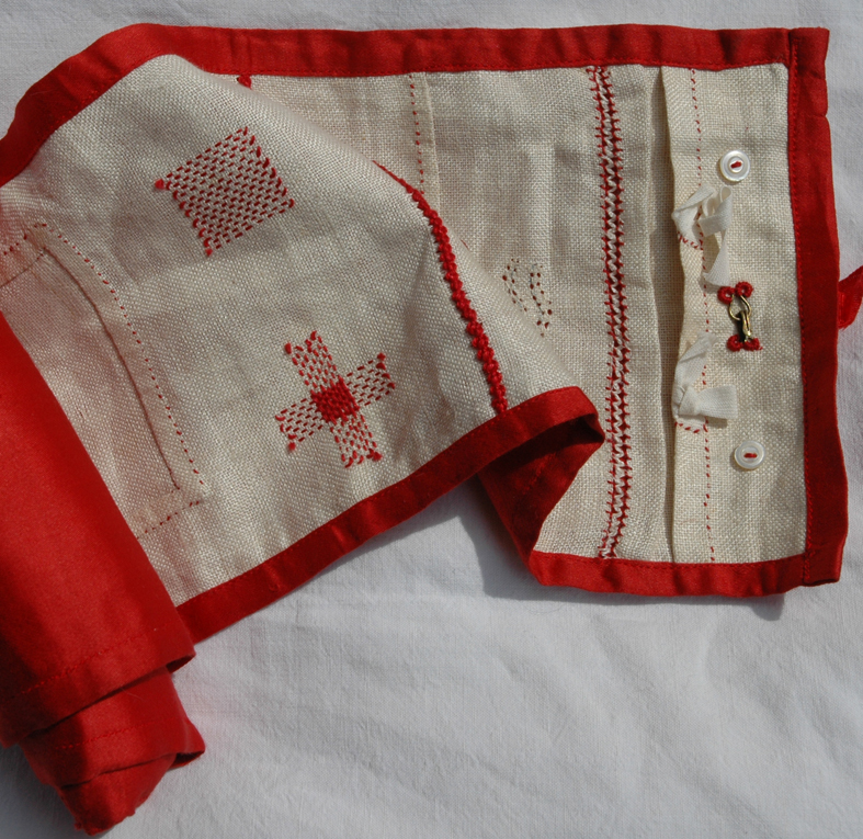 I found the motto, ” Red is the ultimate cure for sadness” and decided to use a patching system using a scrap of scarlet linen, I withdrew the threads and darned them onto the heart. Easy Peasy it wasn’t!