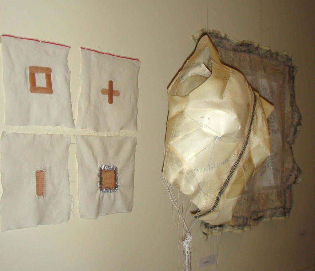 As does Jilly Morris who is an applied artist working across a variety of materials, but here is researching the idea of skin which, for humans, is the area most often in need of mending. She also looked at sticking plasters – below she has pinned them into position onto a sheet of tracing paper liking the translucency akin to areas of our skin.