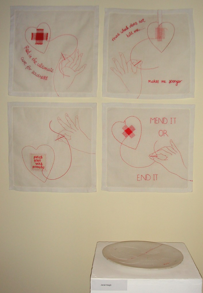 I had called a meeting of the Stitch and Think group who are working towards an exhibition around the idea of mending – a reminder that they had all promised to have working samples ready for early March – I was ahead of the game I had made several pieces of porcelain with mending mottoes on and was feeling pretty confident that I had done enough….then getting out of my car to go into the meeting I dropped the carrier bag containing all 4 porcelain plates. KERACK! My passenger Basil Kardasis said “Thank f… it wasn’t me who did that —– this has happened for a reason Janet”. quick thinking on his behalf but I felt strangely elated.