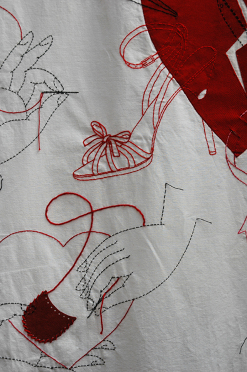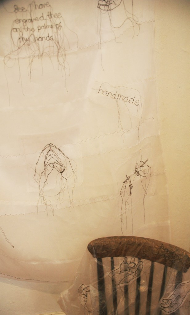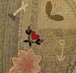 I think many textile makers have flirted with the idea of making jewellry, I certainly have, embroidery and jewellry can share the same small-scale, precious, decorative qualities – but what is always a swine to deal with and often the weakness that lets the whole effect down – is the finish.The backings in particular are so hard to organise and make stable, also the back of a brooch can be more personal than the front, only the wearer sees it, or the person who gives it. So turning these curious designs over it was reassuring and an added pleasure to see the consideration to the finish of each piece.