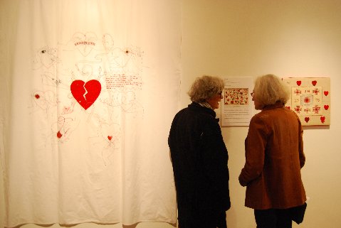 The flower walls give way to hearts (and eyes) so here are my minimally quilted fabric patchworks. This took quite a lot of preparation, pressing on my behalf and for Charles (and Russell) the gallery’s invaluable exhibition men, constantly measuring and sometimes just waiting, but colour co-ordinated!