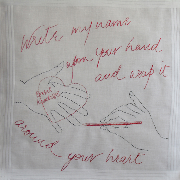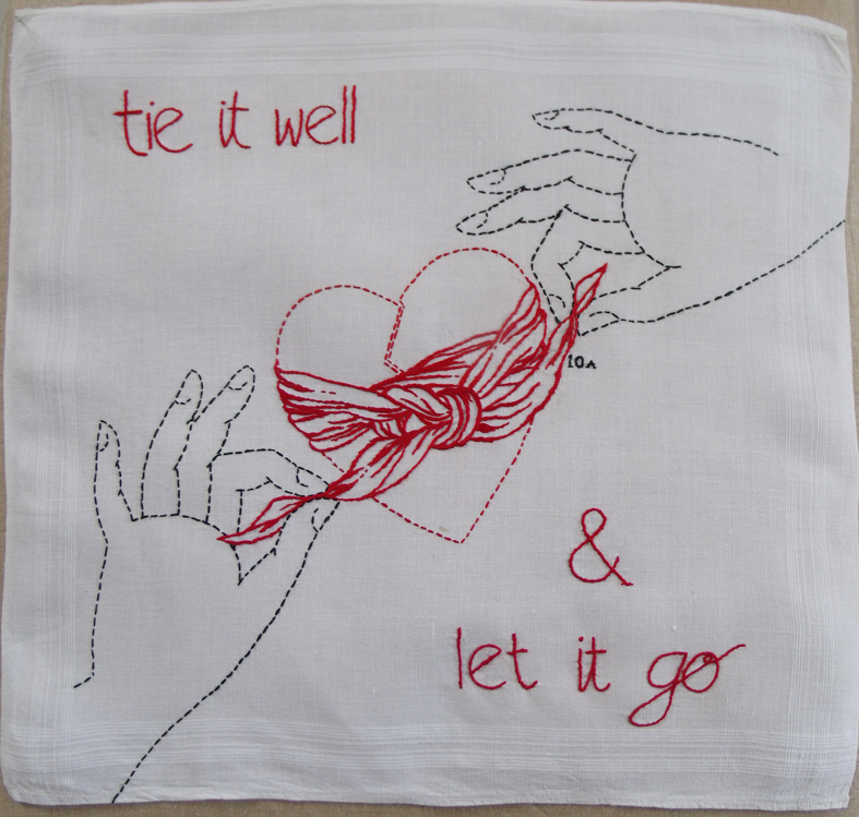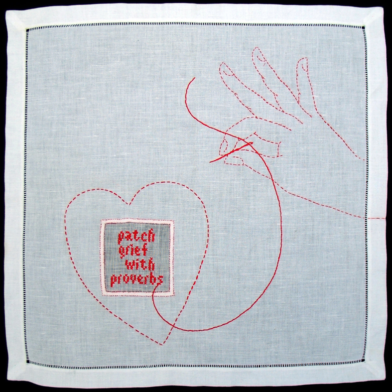 I have made a whole series of embroidered handkerchiefs, let’s face it some nights we have all needed a handkerchief if only to hold on to. So I have embroidered them with positive mending mottoes and other words of wisdom – the set is called ‘ Patch Grief with Proverbs’ a sentiment that rings true to me. How often we just find ourselves reciting platitudes in response to grief?