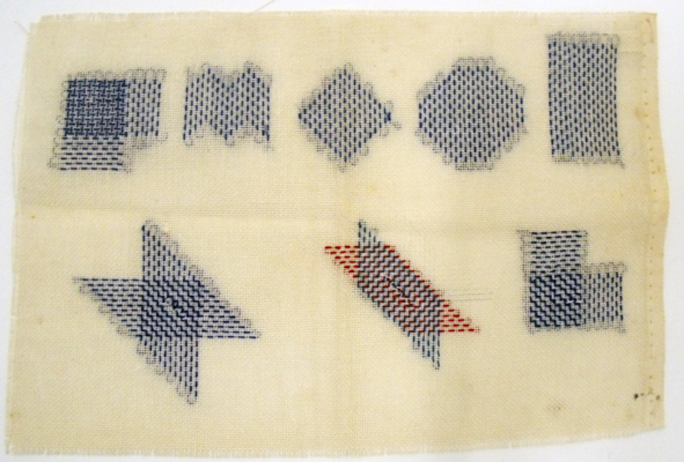 the separate hand drawings with a very crude but vital painted dye and stitching sample.