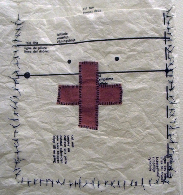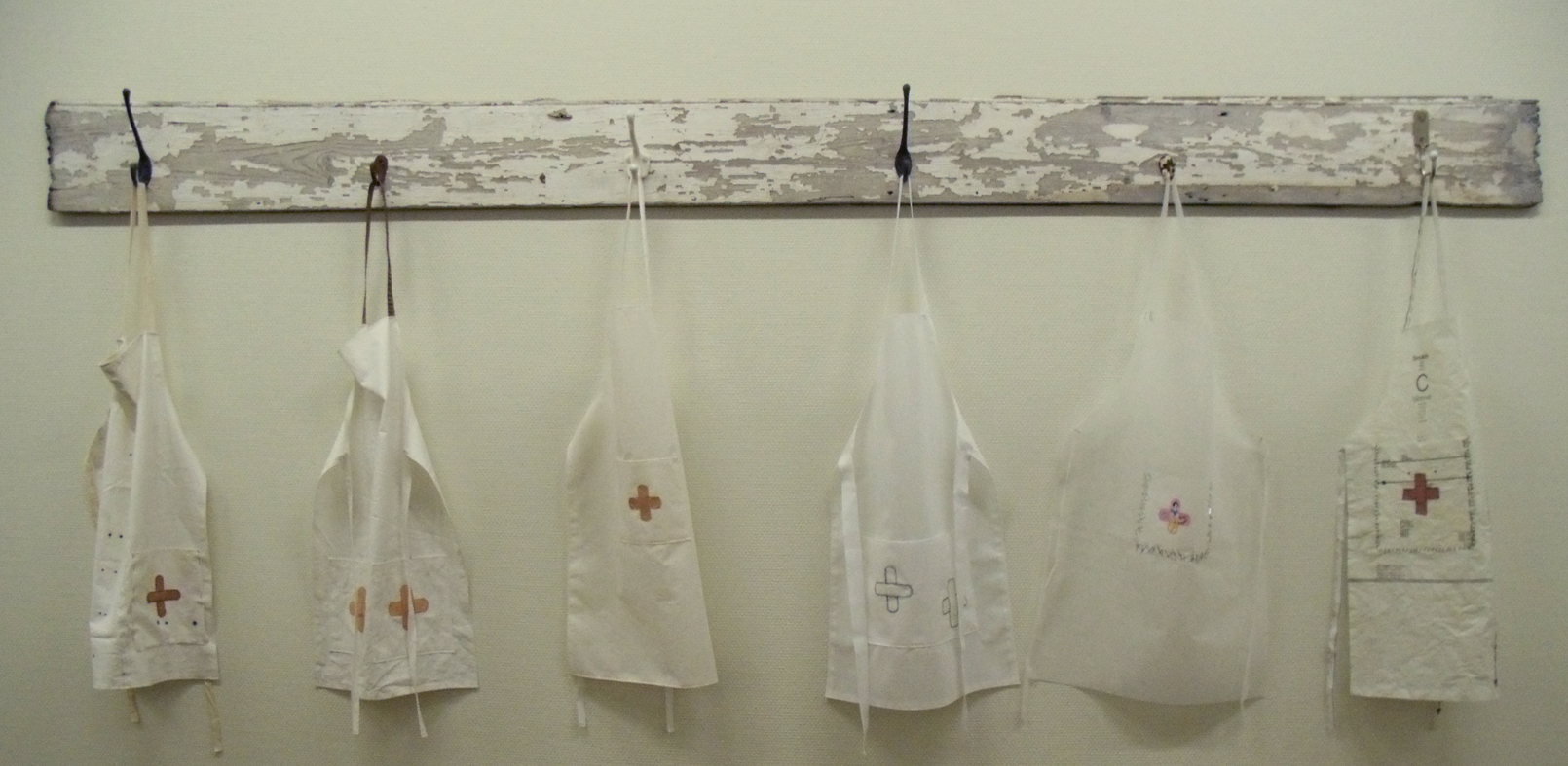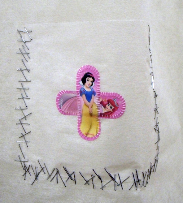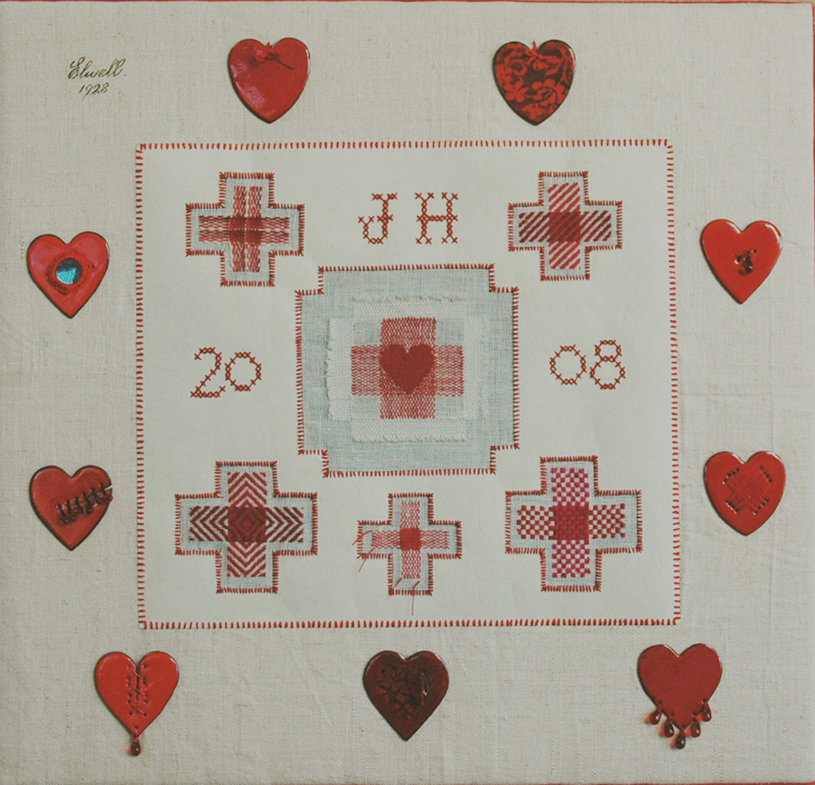 The cross shape made by various commercial medical dressings recall the basic shape of most darns seen on the samplers; when executed in ready-made modern plasters she references the ‘quick fix mentality and disposable culture’ of the present day.