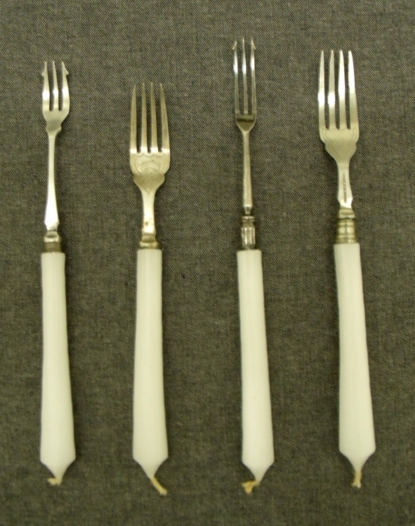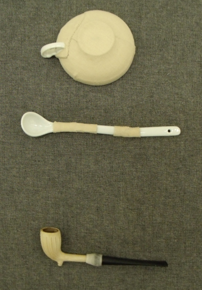 Her work is called “Inappropriate Mendings” and she is having some fun at the idea of making aesthetically elegant mending that is really useless for any practical purposes, fork handles are whittled from wax candles (gedditt?) cups are mended with calico, and spoon handles wrapped in plasters from the first aid tin.