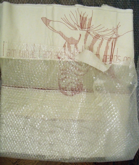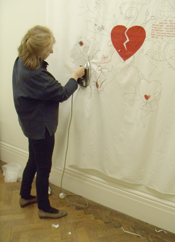 The large Comfort (Hearts)and Security (Quotes) Blankets and Safety Curtain ( Eyes) had been draped over my bannisters for weeks (above right) but a 3 hour car journey had creased them; I am always relieved to be able press my work before it goes on display.