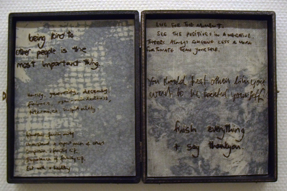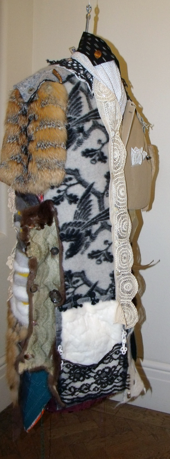 Which brings me neatly to the last exhibitor, Basil Kardasis, his exhibit is called ‘The Buttonhole’, and he collected from his family and friends ( we all had to contribute) ” treasured, revered materials…that may represent them ” and also a button; then , with the help of his sister Ella, spent may months button-holing all the pieces together so that they made a “protective cloak” for his son.