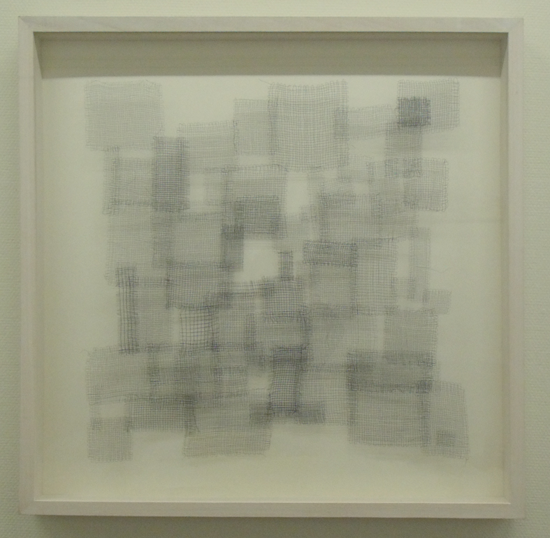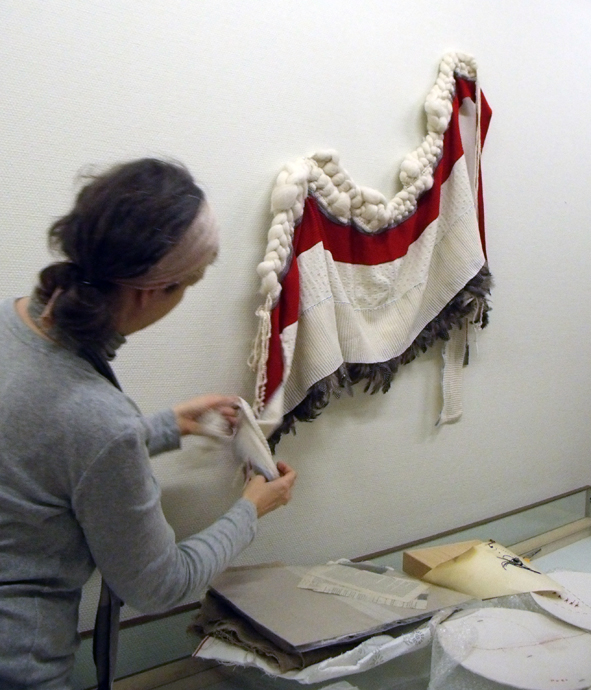 Dail Behennah brought in a fragile darned wire piece, mercifully it was framed and so this was the easiest to hang…the piece is simple and refined and references a particular black darning sampler in the collection, which is placed in a vitrine opposite her work.