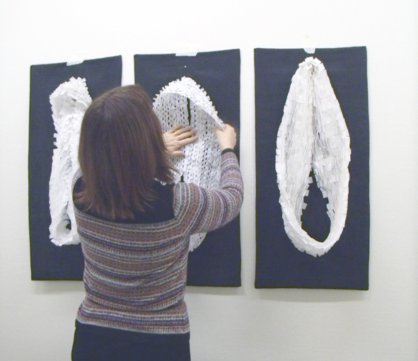 When I arrived on the first morning to hang the work, Dawn and Karin had already placed the exhibits, still in their wrappings, on the floor below the wall space allotted to them, but there were piles of extraneous pieces, scattered over tables and chairs, it became my task to sort these out.