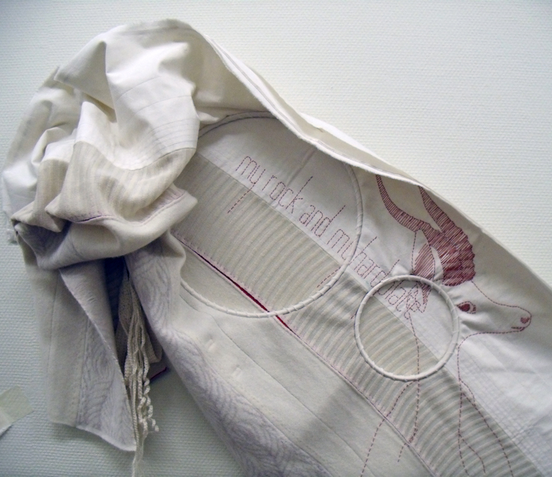 Like Dawn’s exhibited pieces, my own work forms part of an ongoing series of stitched work, that has been a direct consequence of our involvement in this project. “Make it through the Night” includes many references to mending as mending broken hearts has been the major inspiration to my personal work for several years now – as this blog illustrates – there are many postings around the ideas and practice of mending, and the first ever post was about my mended clothes………