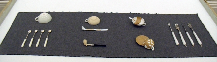 Jess Turrell came in with a box of assorted table-wear cups, saucers and a range of metal components such as spoon bowls, fork tines, knife blades and their specially made handles – which she made up before she placed them in a large vitrine.