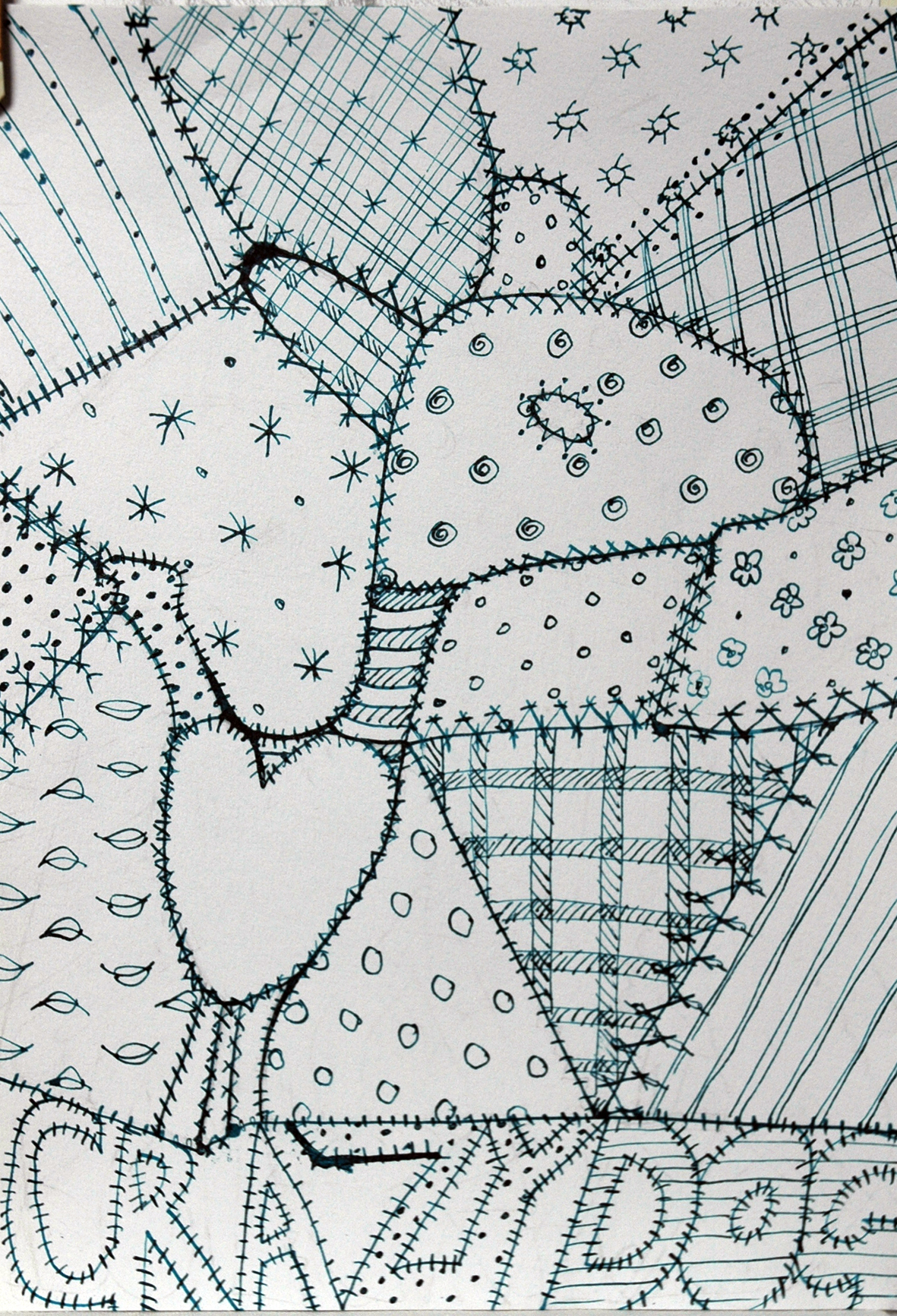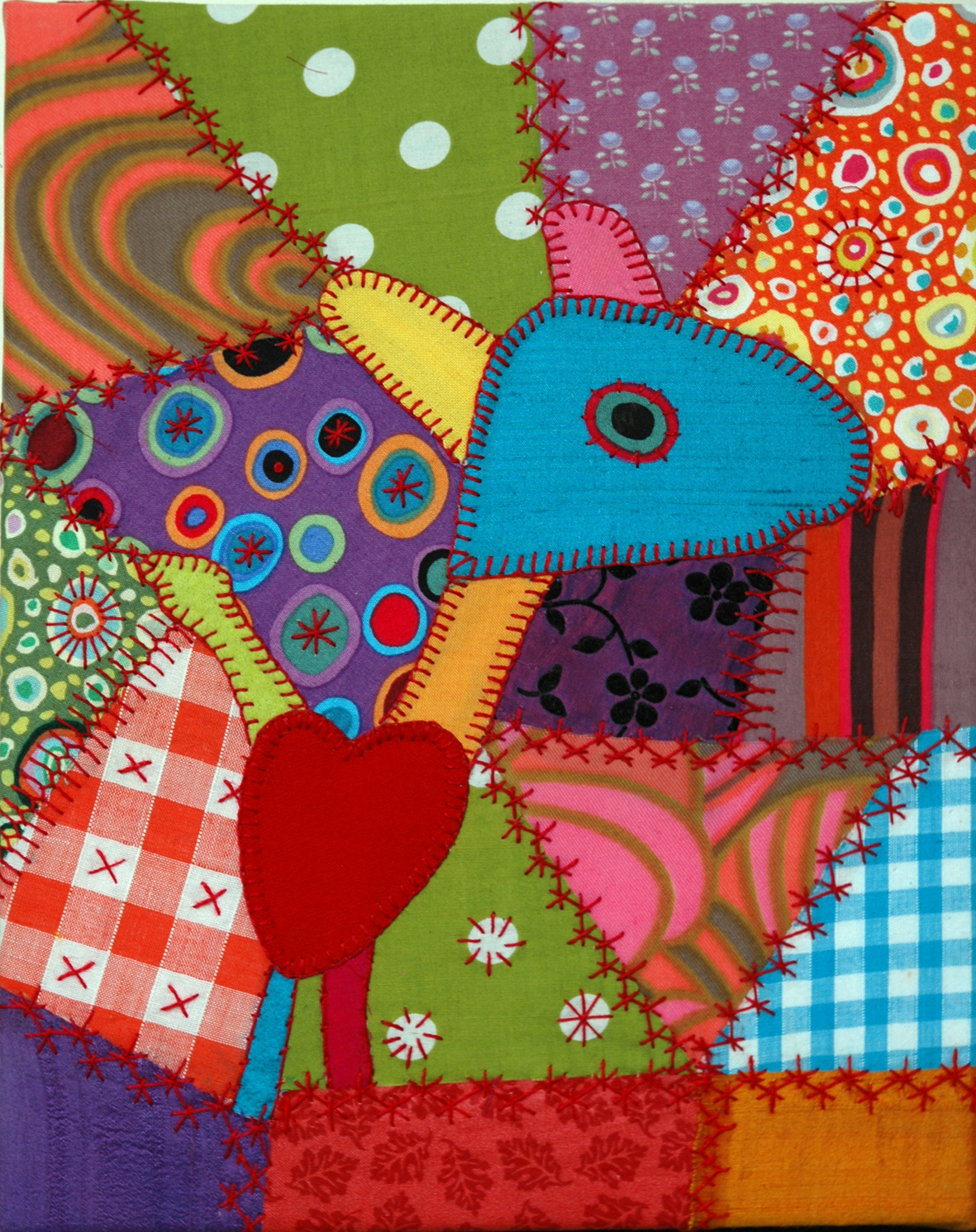 I considered what a strange shape he was and realised that he could be made up in patches, so a crazy patchwork was the obvious answer – and as it is a children’s charity it would make a cheerful, colourful and hopefully saleable work when eventually auctioned