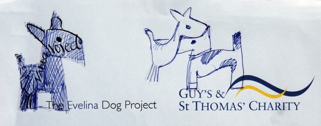 Last month at a party in London and I was asked by Anne Coggle, a friend of the hosts, if we ( Steve my husband and I) would like to make a piece of work each for a charity which she supported; when she explained that it was the Dog Project, ( information available at simon@dogprojectart.org) I accepted at once. I had seen the earlier Dog Project which was for Great Ormond Street Hospital, Boil, the dog was originally drawn by a child being treated there. I was delighted to be offered the chance to get involved apart from the obvious enjoyable contribution to a good cause – most of the currently fashionable artists and designers had made works for the last project, as well as many children from the hospital.