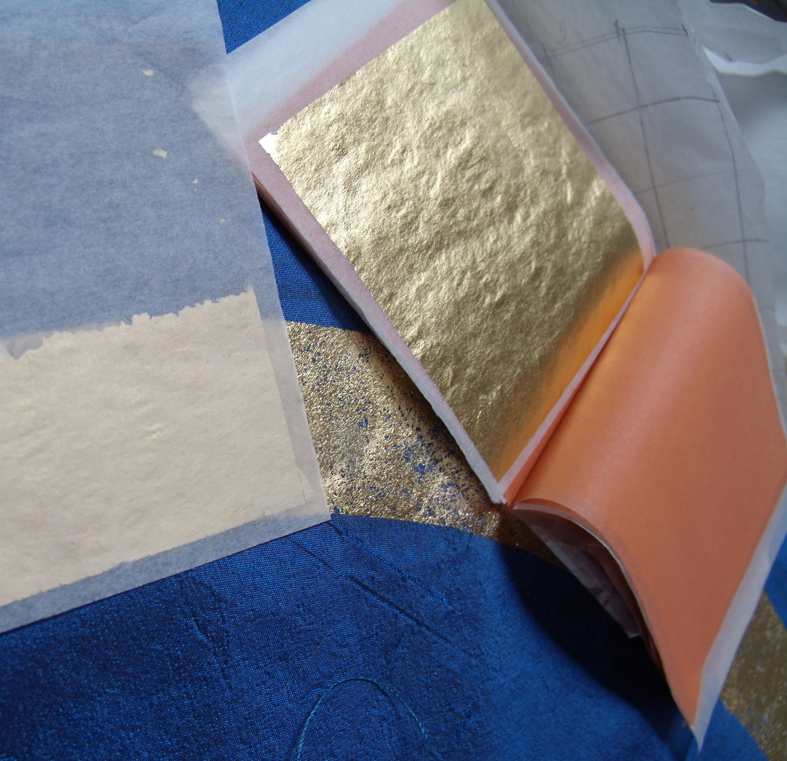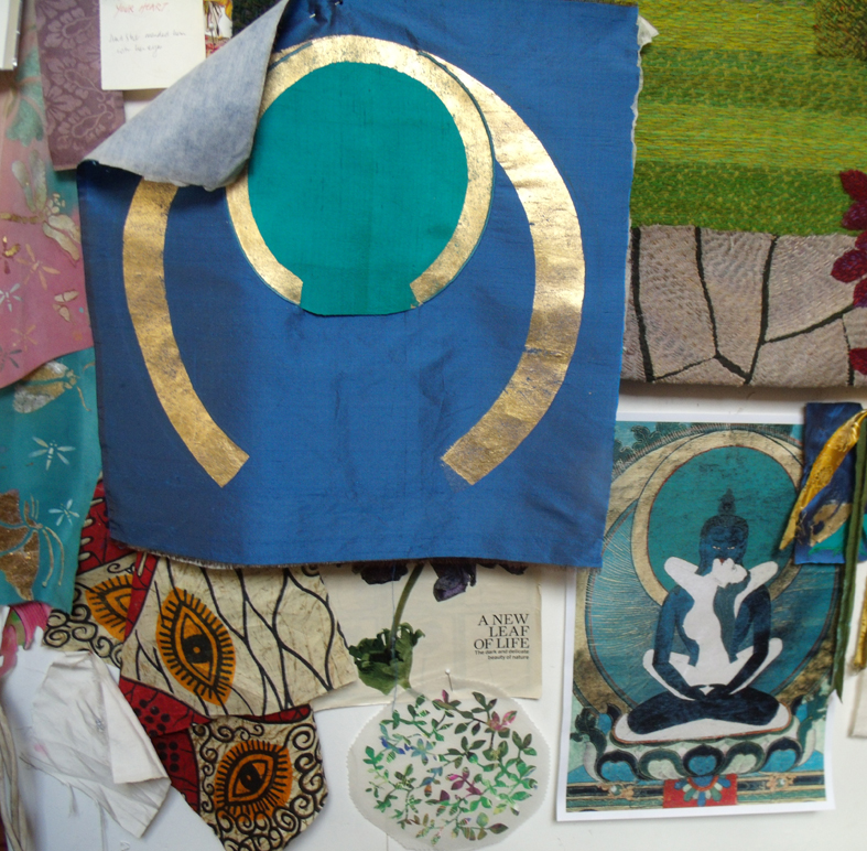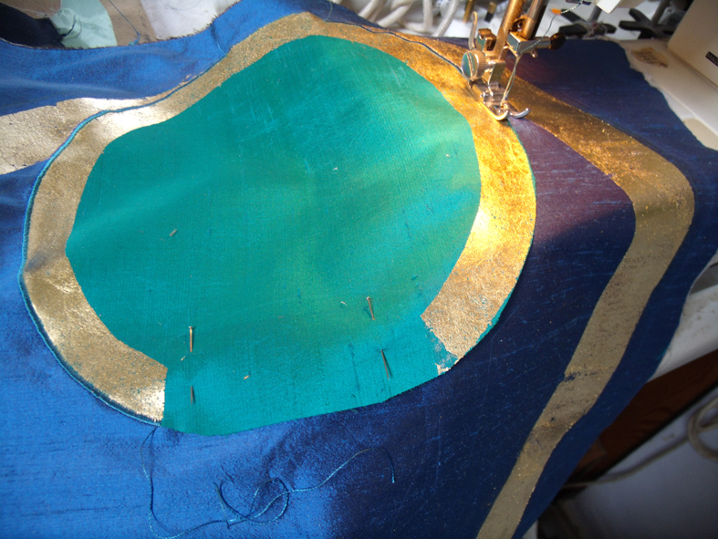 I must say that the fabrics materials I used for this work were really sumptuous,real gold leaf for the 2 bands of light surrounding the figures. by some alchemy I had every piece of material needed in my own stash; the gold leaf and threads, the heavy silk brocades were in the perfect colours. Later in the project a few would have to be hand painted and dyed.