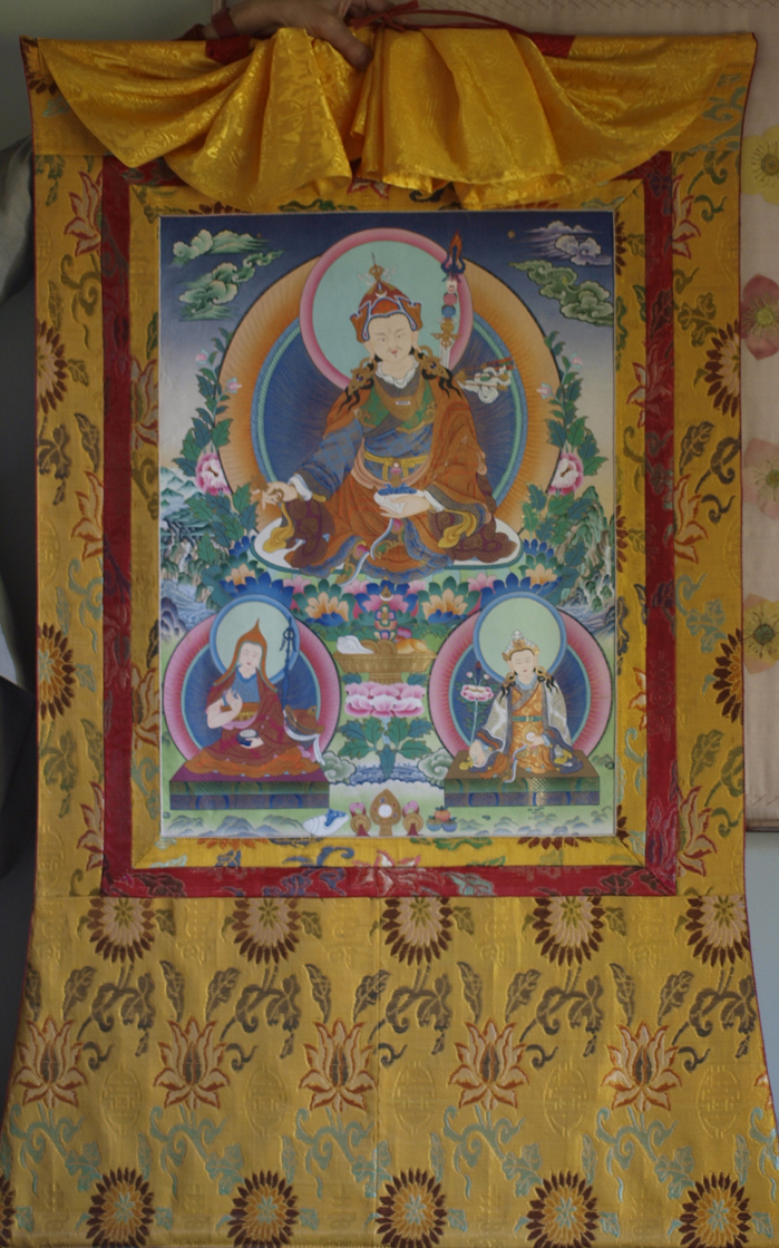 Looking at the wealth of fabrics surrounding the Tibetan paper image that he brought, I was enthralled. I suddenly knew why I kept all my old fabrics, silver woven saris, Japanese and Chinese silk brocades – to use for this glorious commission. I showed him several of the fabrics I had that I thought would work as the frame, I precisely measured the large Thangka and gleaned as much information as I could about the meaning and purpose of the image chosen and Thangkas in general. I made a “worst scenario” price and it was accepted….