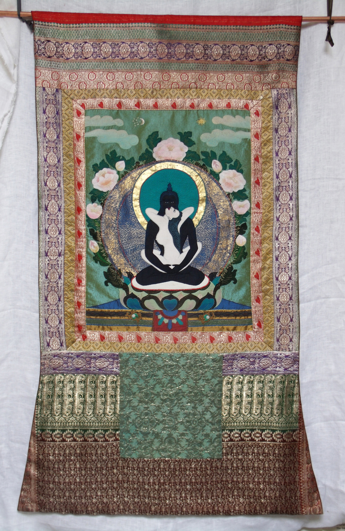 I was shown a painted Thangka by a friend, who practices the strict discipline of Tibetan Buddhism; he also showed me an image of the Primordial Buddha ( the Buddha with his female partner Samantabadri, signifying the union of wisdom and compassion) that his partner found particularly resonant, she has a small postcard pinned up of it in her study. He wanted it translating into a fully formed Thangka……and asked me if I would like to attempt it – as her birthday present.