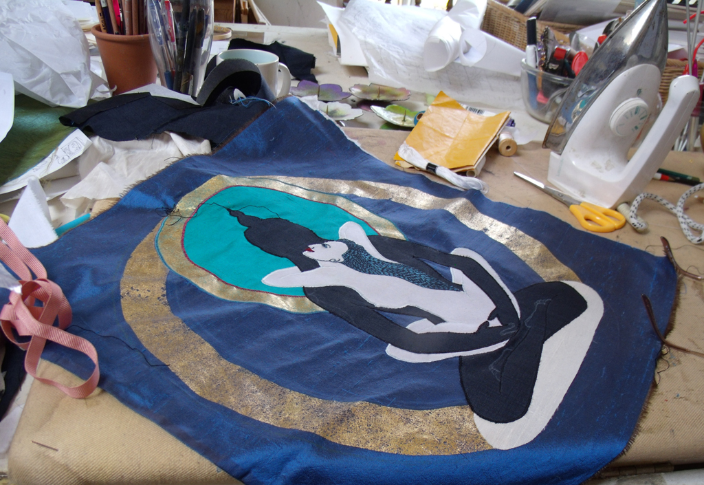The lotus flowers were bonded into position, petal by petal with leaves underpinning them into a garland which were then machine stitched in a gold flecked thread.