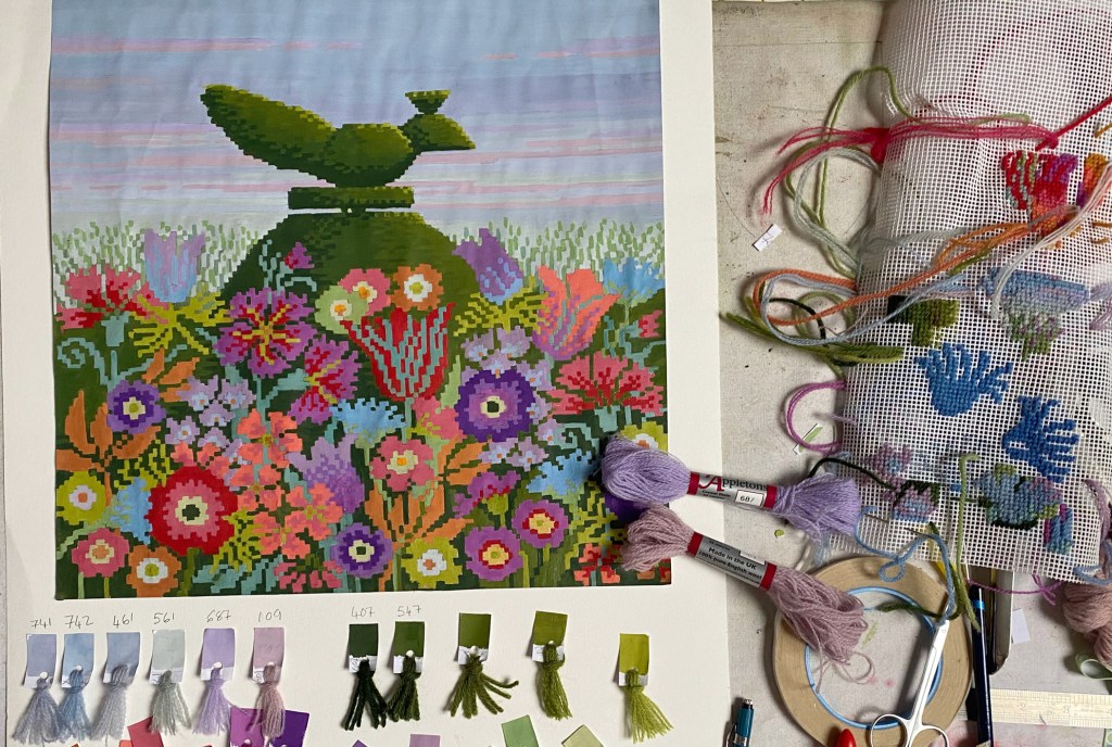 A detail from the Ehrman Tapestry section in my studio shelving, with samples of previous designs next to the range of Appleton’s wools. And on the right the range of colours I chose to sample stitch the flowers and leaves.