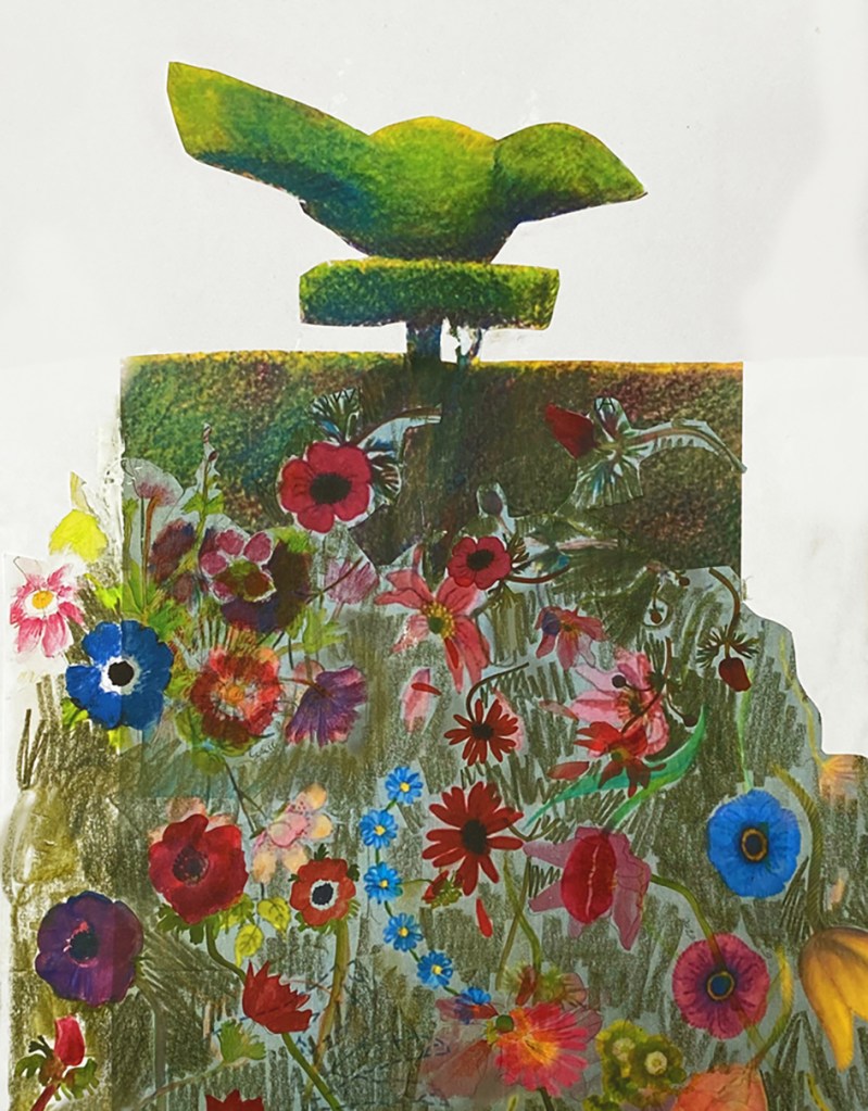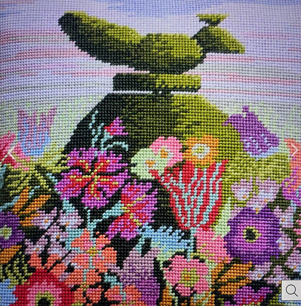 Above is the first idea for my Topiary design – as a paper collage of photocopies from my old garden designs, next to it is the finished stitched canvas cushion cover, as seen in the new Ehrman catalogue.