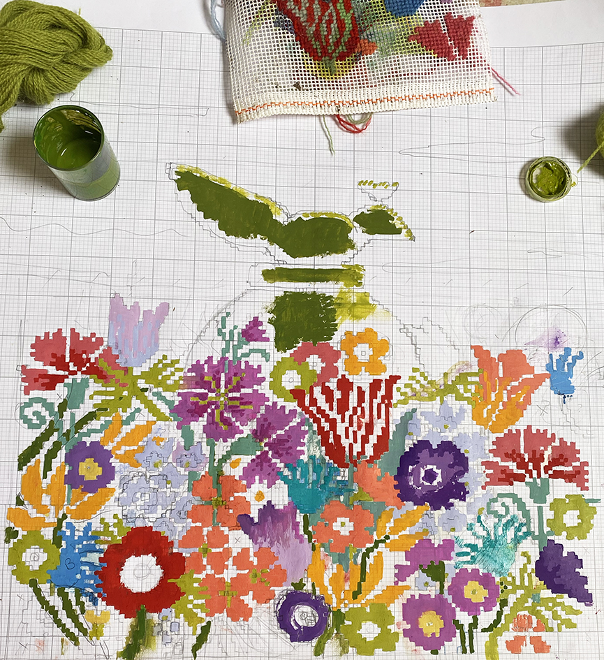The next step, after slowly developing the complete version of the drawn, stencilled and collaged design seen above, is to trace and paint the chart for stitching the wools onto canvas. First things first – choose the yarns to match the colours for the painting the chart in gouache.