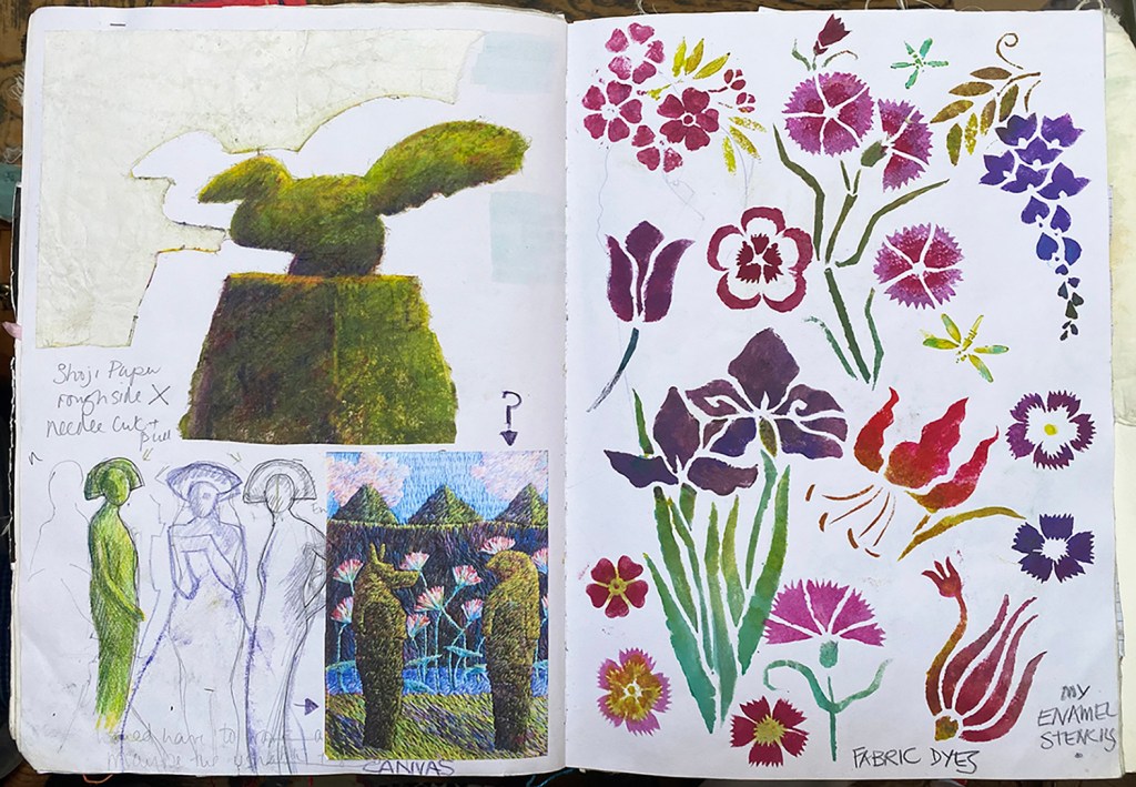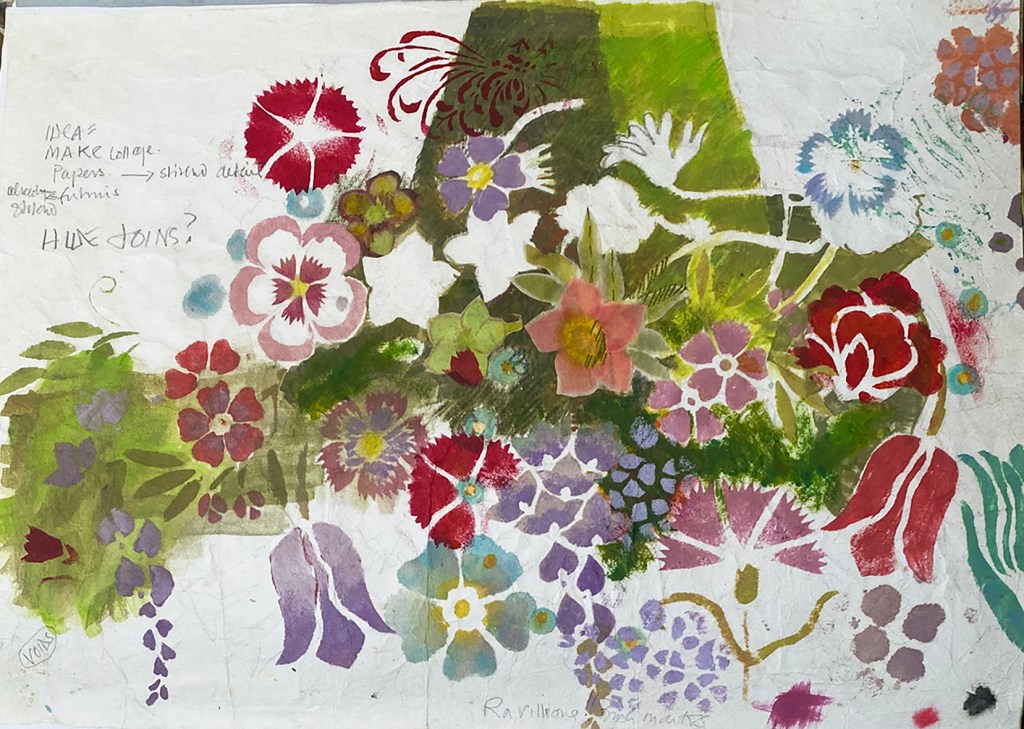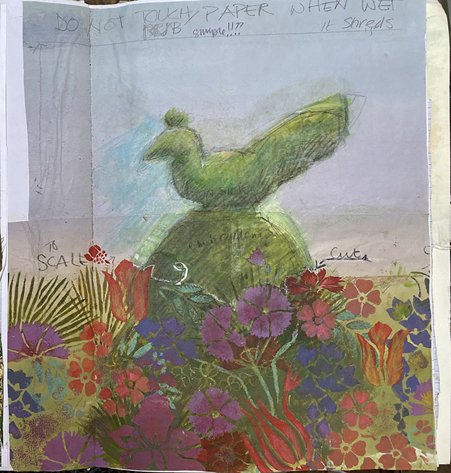 And here is the way it happened: First I found some of my old stencils, and I printed them over a collage of older drawings and embroideries of topiary birds. Eventually making a rough version of the new design on Japanese shoji paper, this is both strong and lightweight and can be easily stitched, it is proving very interesting to work with .