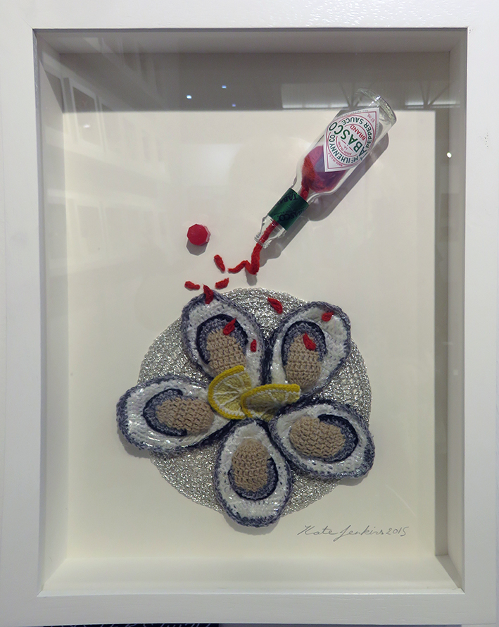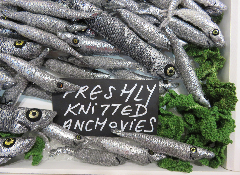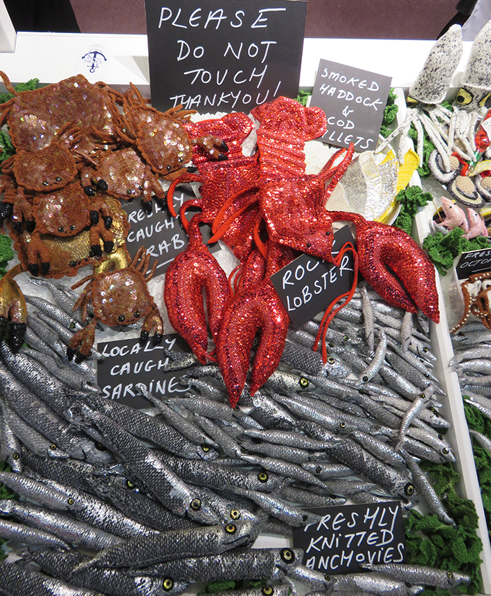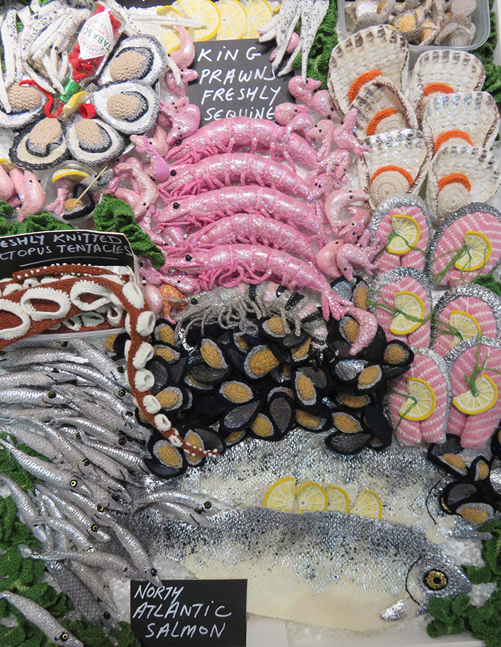 The installation was designed specially for the Knitting and Stitching show by Kate Jenkins, Everything on the stand was completely in keeping with the joke…from the dressed shop assistants that like all good fishmongers knew their subject inside out and wanted to share their delight and knowledge with you, to the stunning array of ‘ seafood’ on offer…