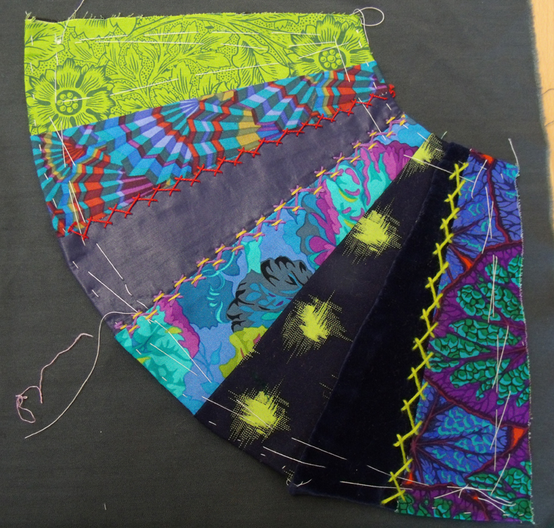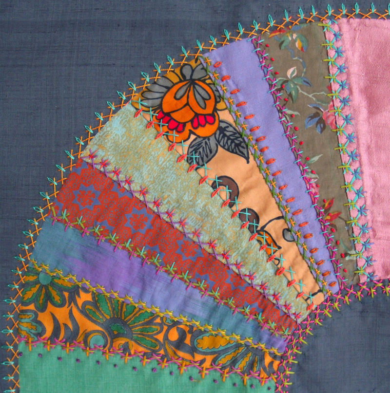 crazy patchwork with ribbons hand embroidered into position between the patches of shot cottons