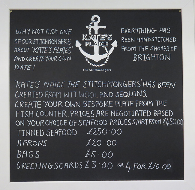 the hand written sign below, perfectly in keeping with the whole fish shop ethic, was written to deter a fellow exhibitor, an embroiderer, who pawed the little sequined morsels as they were being arranged, and was extremely rude when he was asked to stop! This is such an unusual occurance – stall holders being rude to anyone, let alone one another that I feel it deserves reporting.