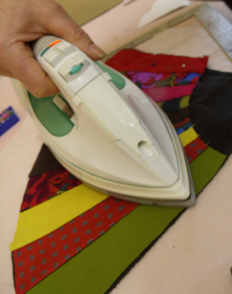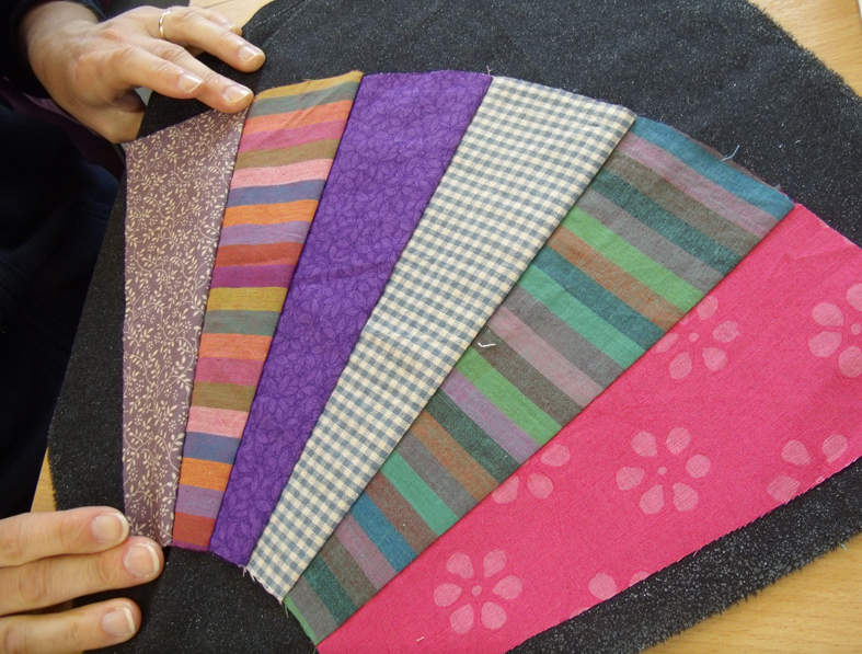organising the fan sections is much easier and quicker than for usual odd shapes of crazy patches. The sections were laid over one another and then pinned and using running stitches held section by section till the fan was complete. The complete arrangement was then pressed onto the special heat activated fabric backing