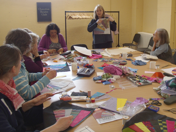 a rare shot of me teaching – explaining how to deal with coloured ground fabrics using a soft and subtle piece of patchwork.