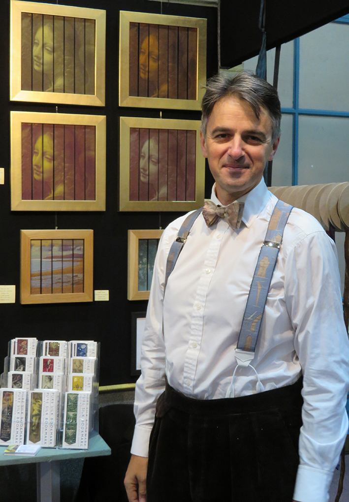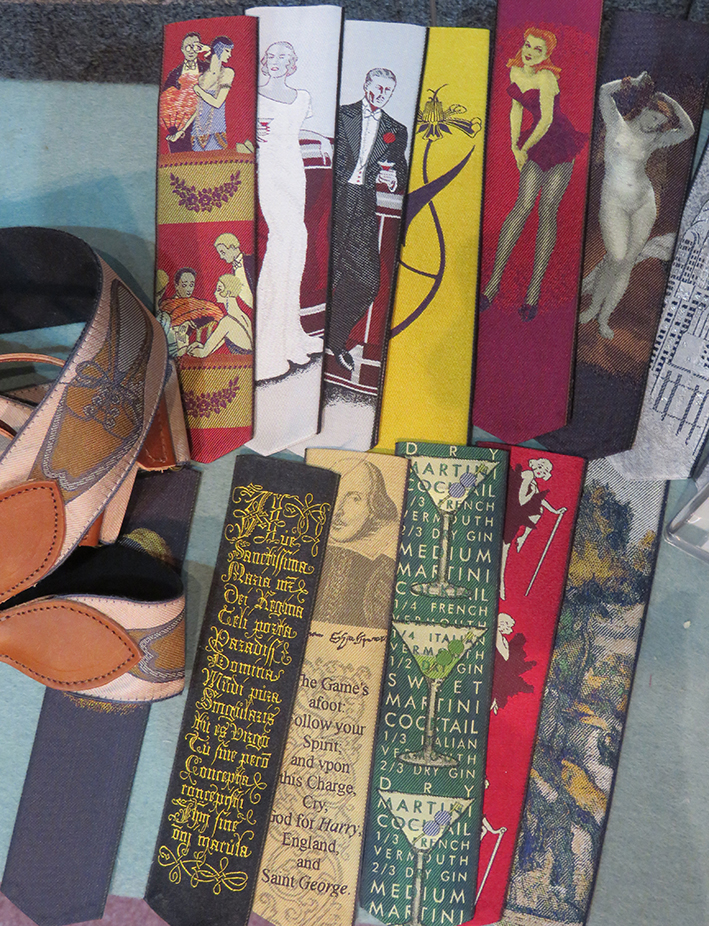 It is difficult to show a range of different work in such a small space as a booth in the fair – but here Robert Ely has managed to do exactly that – he shows his woven ribbon design work, such as braces and book marks with his more art based weavings of sea and landscapes – the ribbon dimensions are shared but the colour depth and small scale pointilism is also evident in both sets of work – seen below are the 2 types of work on display